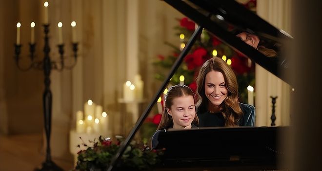 节目开场,便呈现了一段温馨的画面:43岁的凯特与10岁的女儿夏洛特公主在温莎城堡内厅联袂演奏苏格兰作曲家厄兰·库珀(Erland Cooper)的作品《霍尔姆海峡》(Holm Sound),为全国观众献上一场别具意义的钢琴二重奏。
